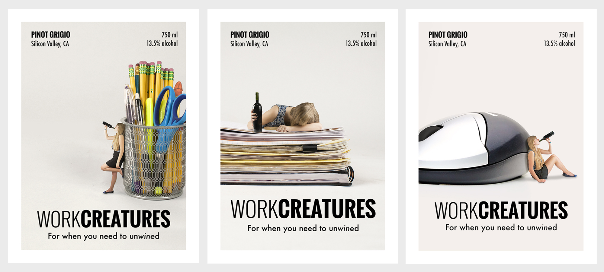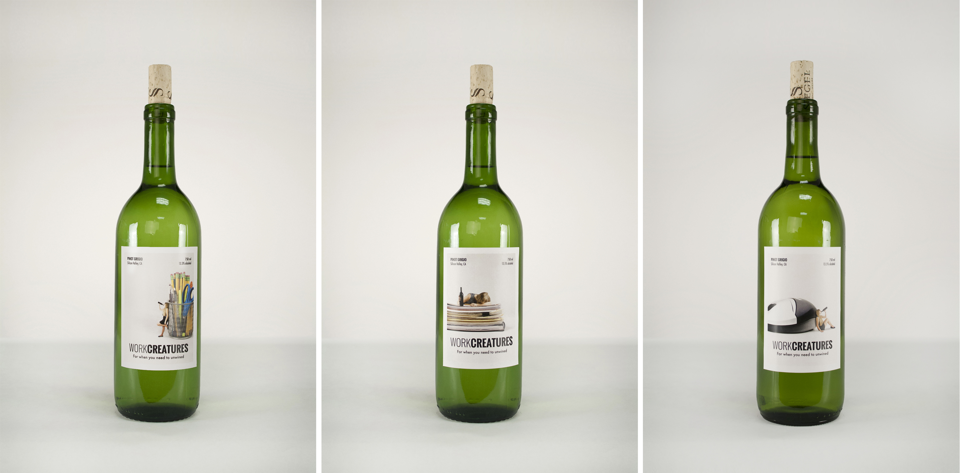A series of wine bottle labels for WorkCreatures, a wine for people who hate their jobs.
